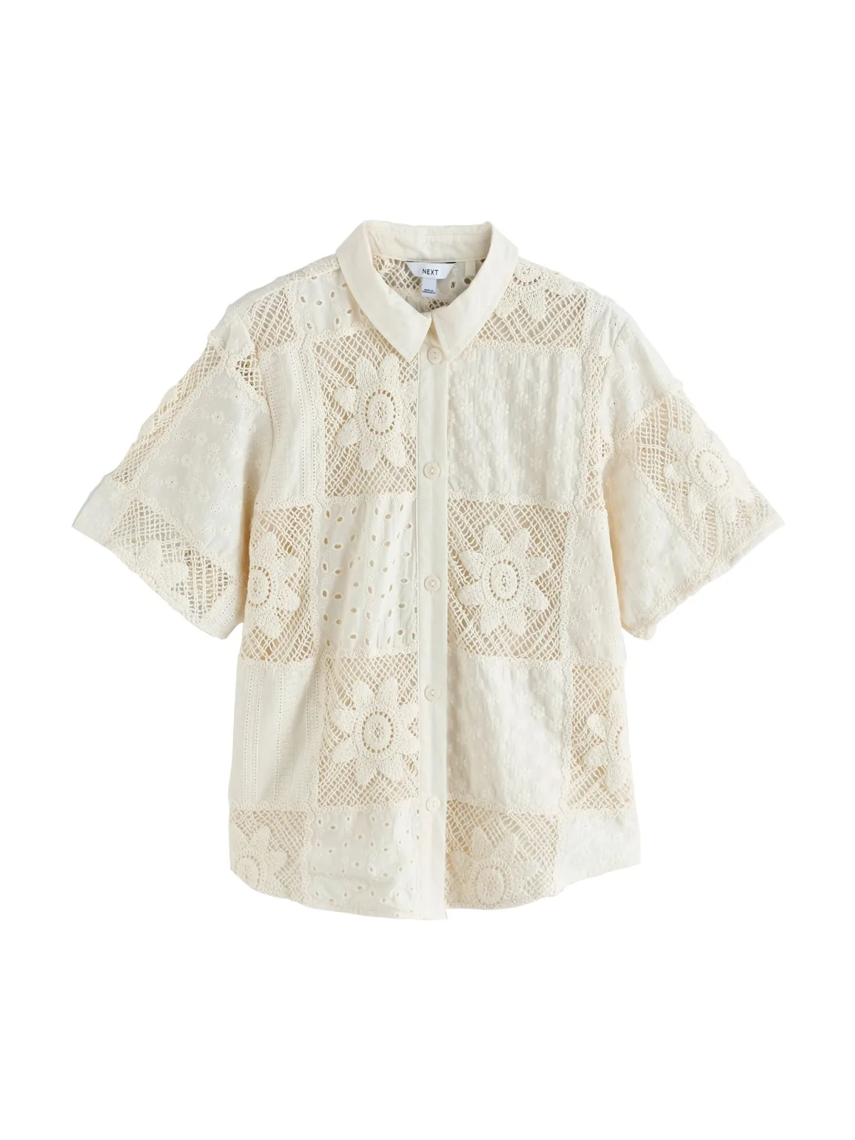 Blouse type: Klassieke blouse; Design: Overcut schouder; Type sluiting: Knoopsluiting; Materiaal: Gehaakt; Motief: Effen; Kraag: Kentkraag; Details: Borduursels, Mesh; Extra's: Licht transparant; Pasvorm: Losse pasvorm; Armlengte: Halve mouw; Lengte: Normale lengte