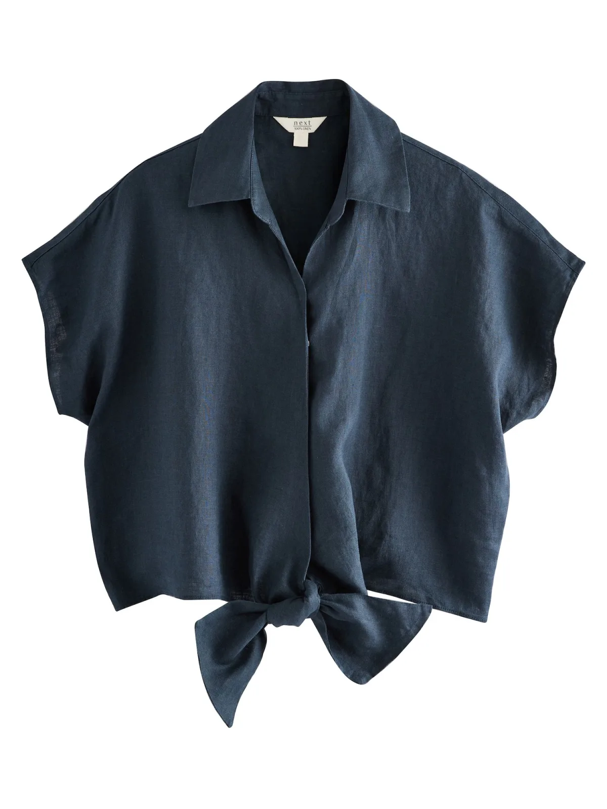 Blouse type: Klassieke blouse; Design: Gesneden mouw, Om te knopen/binden; Type sluiting: Drukknoop; Materiaal: Linnen; Motief: Effen; Kraag: Kentkraag; Details: Gedrapeerd; Extra's: Op staal naden; Pasvorm: Losse pasvorm; Armlengte: Kwartmouw; Lengte: Normale lengte