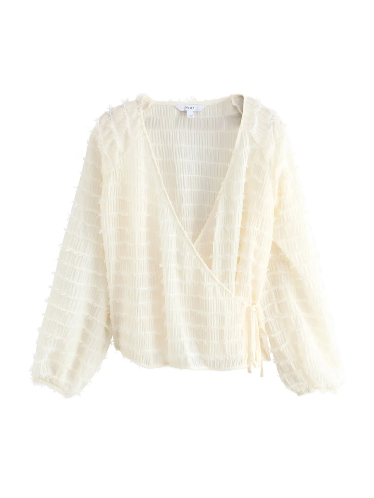 Blouse type: Blouseshirt; Design: Diepe snit/decolleté, Om te knopen/binden; Materiaal: Gerecycled materiaal; Halstype: V-hals; Motief: Effen; Kraag: Zonder kraag; Details: Franjes, Gedrapeerd, Wikkel design; Extra's: Op staal naden, Met textuur; Pasvorm: Losse pasvorm; Armlengte: Lange mouw; Lengte: Normale lengte