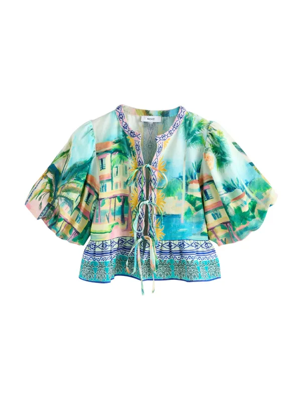Blouse type: Blouseshirt; Design: Met band/snoer, Pofmouwen; Materiaal: Katoen; Kraag: Tuniek kraag; Details: Gedrapeerd; Extra's: All-over patroon; Pasvorm: Normale pasvorm; Armlengte: Halve mouw; Lengte: Normale lengte