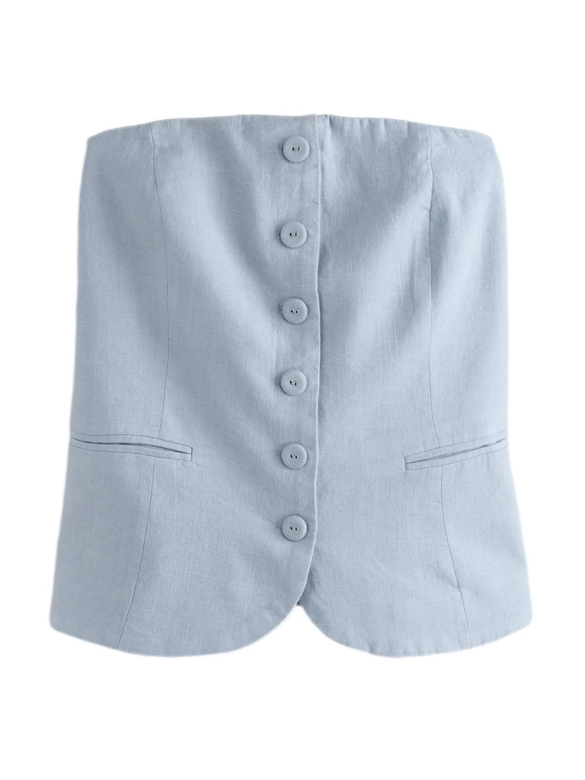 Blouse type: Wijde blouse; Design: Gevoerde zoom/rand, Opzet-/flapzak, Anti-slip band; Type sluiting: Knoopsluiting; Materiaal: Linnen; Motief: Effen; Kraag: Zonder kraag; Extra's: Op staal naden; Pasvorm: Normale pasvorm; Armlengte: Mouwloos; Lengte: Normale lengte