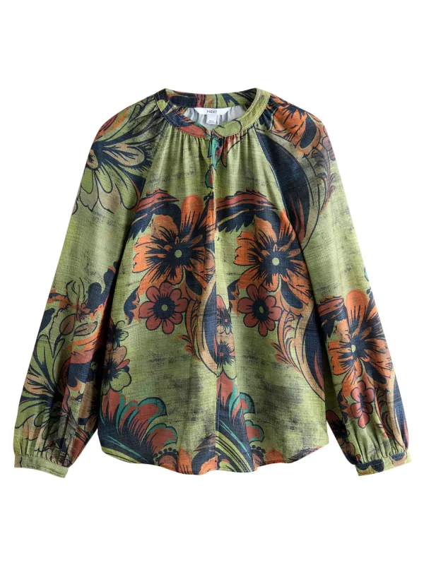 Blouse type: Klassieke blouse; Design: Gevoerde zoom/rand; Type sluiting: Knoopsluiting; Materiaal: Gerecycled materiaal; Motief: Bloemenprint; Kraag: Tuniek kraag; Details: Cut-outs, Gedrapeerd; Extra's: All-over patroon; Pasvorm: Losse pasvorm; Armlengte: Lange mouw; Lengte: Normale lengte