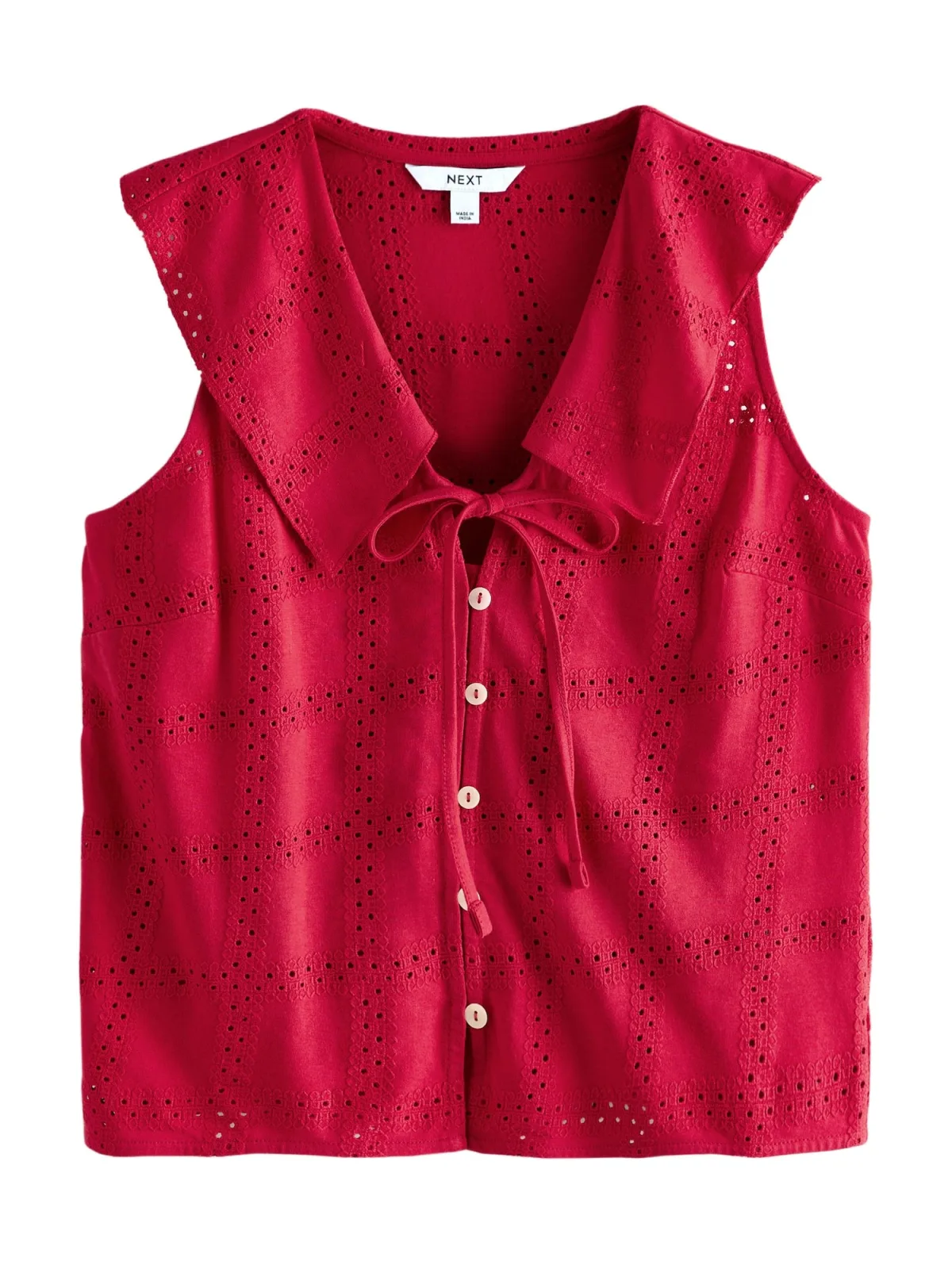 Blouse type: Wijde blouse; Design: Om te knopen/binden; Type sluiting: Knoopsluiting; Materiaal: Katoen; Motief: Effen; Details: Ruches, Borduursels; Extra’s: Op staal naden; Pasvorm: Normale pasvorm; Armlengte: Mouwloos; Lengte: Normale lengte