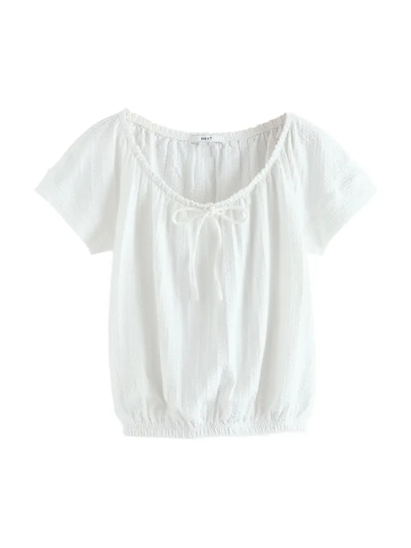 Blouse type: Wijde blouse; Design: Gevoerde zoom/rand, Elastische taille/zoom, Om te knopen/binden; Materiaal: Katoen; Halstype: Ronde hals; Motief: Effen; Kraag: Zonder kraag; Details: Gedrapeerd; Extra's: Gestructureerd oppervlak, Op staal naden, Voelt zacht aan; Pasvorm: Losse pasvorm; Armlengte: Kwartmouw; Lengte: Normale lengte