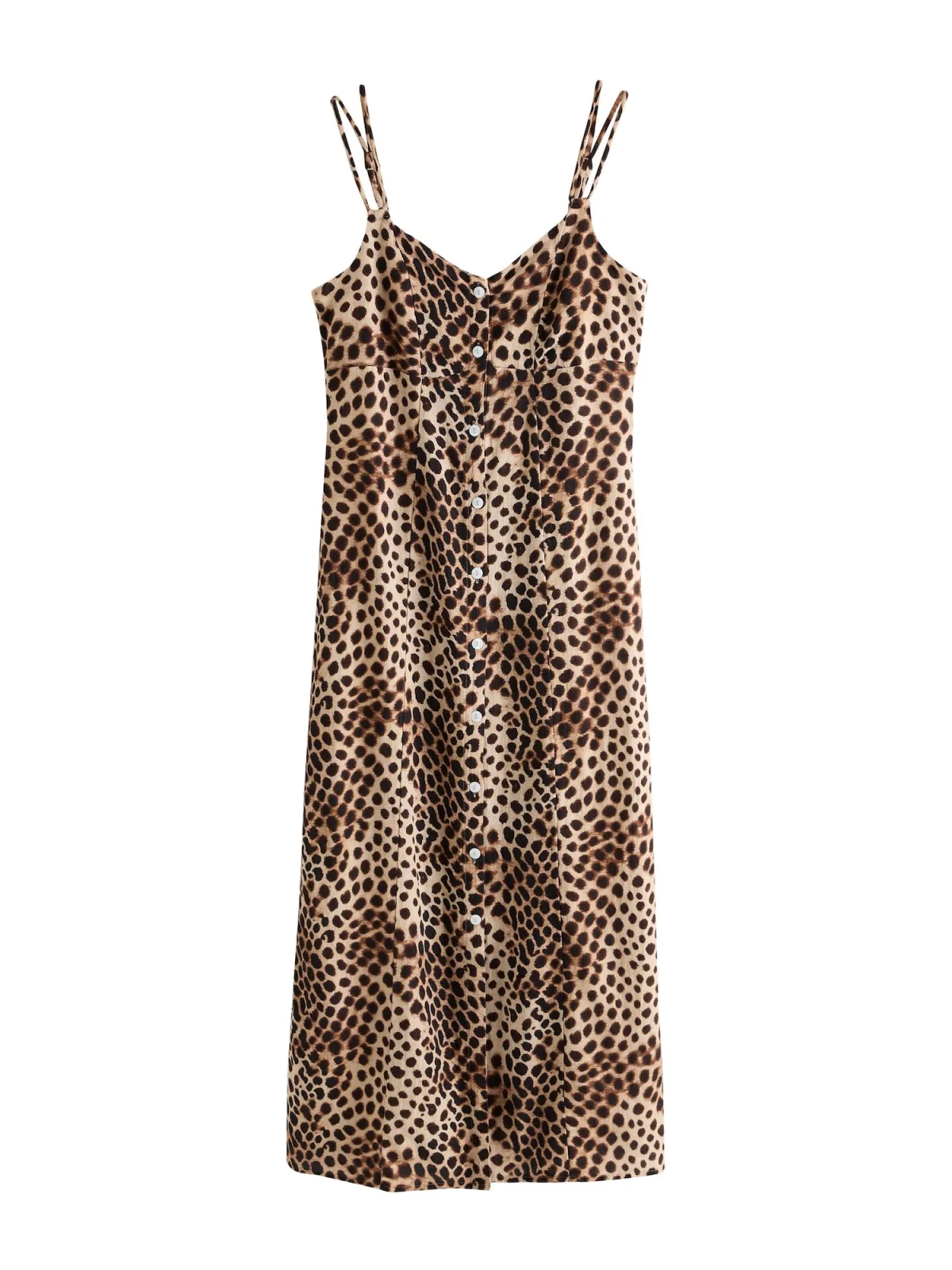 Design: Gevoerde zoom/rand, Knop placket; Type sluiting: Knoopsluiting; Materiaal: Viscose; Motief: Dierenprint; Kraag: Zonder kraag; Soort bandjes: Spaghettibandjes; Details: Cut-outs; Extra's: All-over patroon, Voelt zacht aan; Lengte: 3/4 lengte; Snit: Recht; Pasvorm: Normale pasvorm; Armlengte: Mouwloos