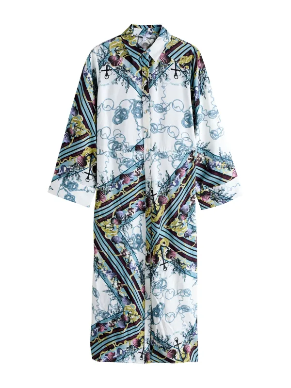 Design: Placket, Taille met trekkoord; Type sluiting: Knoopsluiting; Materiaal: Viscose; Kraag: Kentkraag; Extra's: All-over patroon; Lengte: 3/4 lengte; Snit: Recht; Pasvorm: Losse pasvorm; Armlengte: Lange mouw