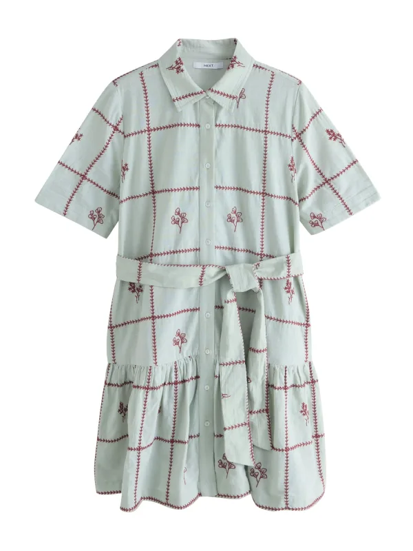 Design: Gevoerde zoom/rand, Knop placket, Tailleriem; Type sluiting: Knoopsluiting; Materiaal: Katoen; Kraag: Kentkraag; Details: Borduursels, Volant, Gedrapeerd; Extra’s: All-over patroon, Voelt zacht aan; Lengte: Kort/mini; Snit: Getailleerd; Pasvorm: Normale pasvorm; Armlengte: Kwartmouw