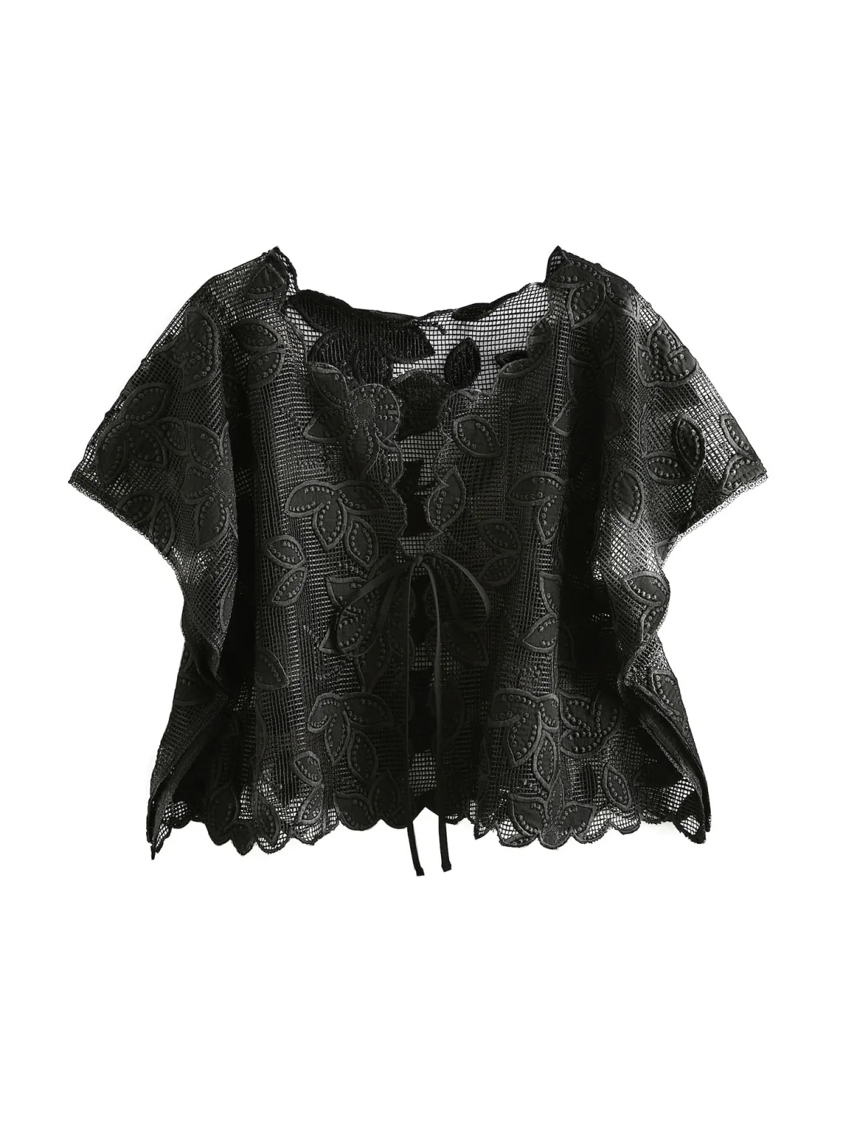 Blouse type: Blouseshirt; Design: Om te knopen/binden, Geschulpte zoom; Materiaal: Gerecycled materiaal; Motief: Bloemenprint; Kraag: Zonder kraag; Details: Kant; Extra's: Mesh, Transparant; Pasvorm: Losse pasvorm; Armlengte: Kwartmouw; Lengte: Normale lengte