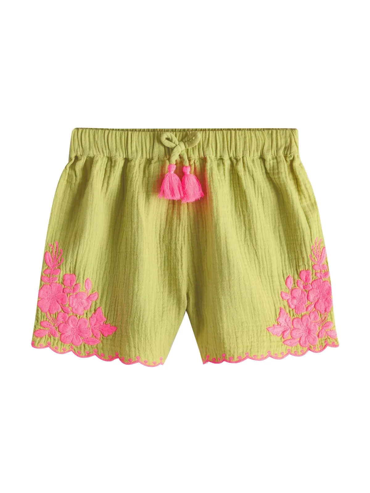 Design: Elastische taille/zoom; Type sluiting: Elastische band; Materiaal: Mousseline; Motief: Bloemenprint; Details: Borduursels; Extra's: Franjes, Applicaties; Lengte: Kort/mini; Pasvorm: Loosefit; Taillehoogte: Mid waist