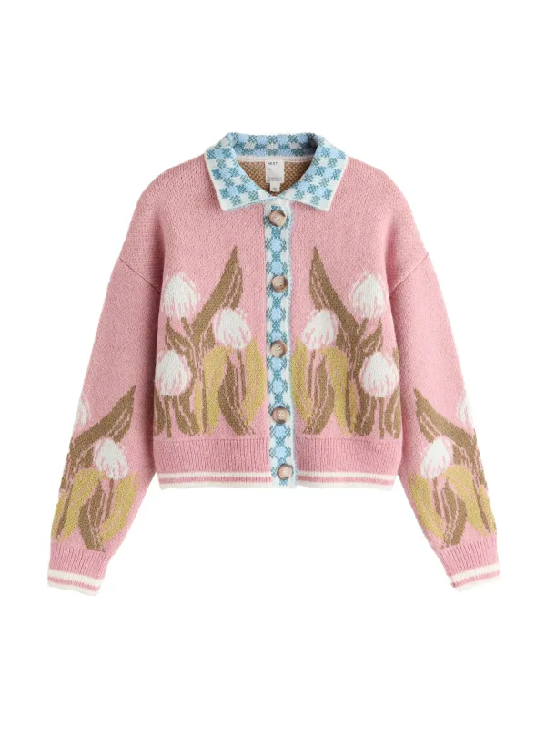 Next Gebreid vest ‘Tulip’ olijfgroen / lichtgroen / rosa / wit