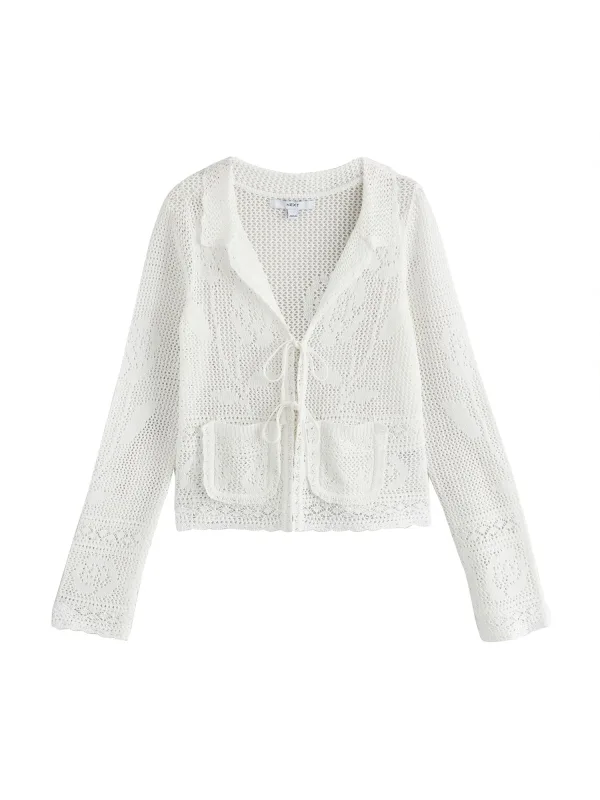 Design: Om te knopen/binden, Opgezette zakken; Type sluiting: Snoersluiting; Materiaal: Knitwear; Halstype: Reverskraag; Motief: Bloemenprint; Details: Mesh; Extra's: All-over patroon, Voelt zacht aan; Pasvorm: Normale pasvorm; Armlengte: Lange mouw; Lengte: Normale lengte