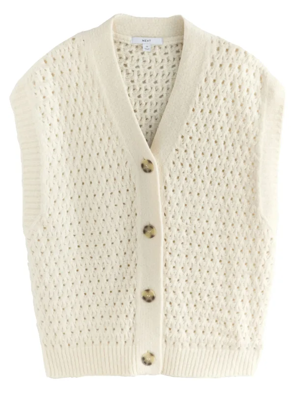 Design: Knop placket, Geribd ceintuurtje; Type sluiting: Knoopsluiting; Materiaal: Knitwear; Halstype: V-hals; Motief: Effen; Details: Mesh; Extra's: Op staal naden, Met textuur; Pasvorm: Losse pasvorm; Armlengte: Mouwloos; Lengte: Lange pasvorm