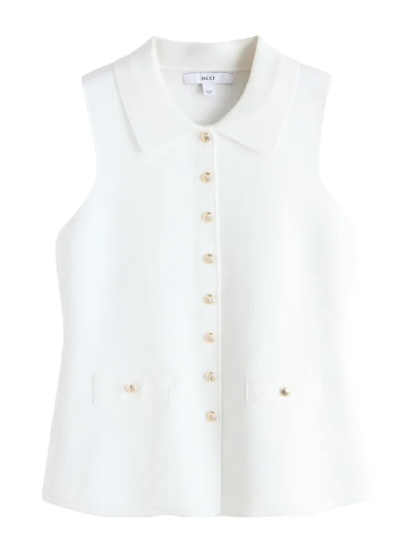 Design: Knop placket, Turn-down kraag, Nepzakken; Type sluiting: Knoopsluiting; Materiaal: Knitwear; Halstype: Overhemdkraag (klassiek); Motief: Effen; Extra's: Op staal naden, Voelt zacht aan; Pasvorm: Normale pasvorm; Armlengte: Mouwloos; Lengte: Normale lengte