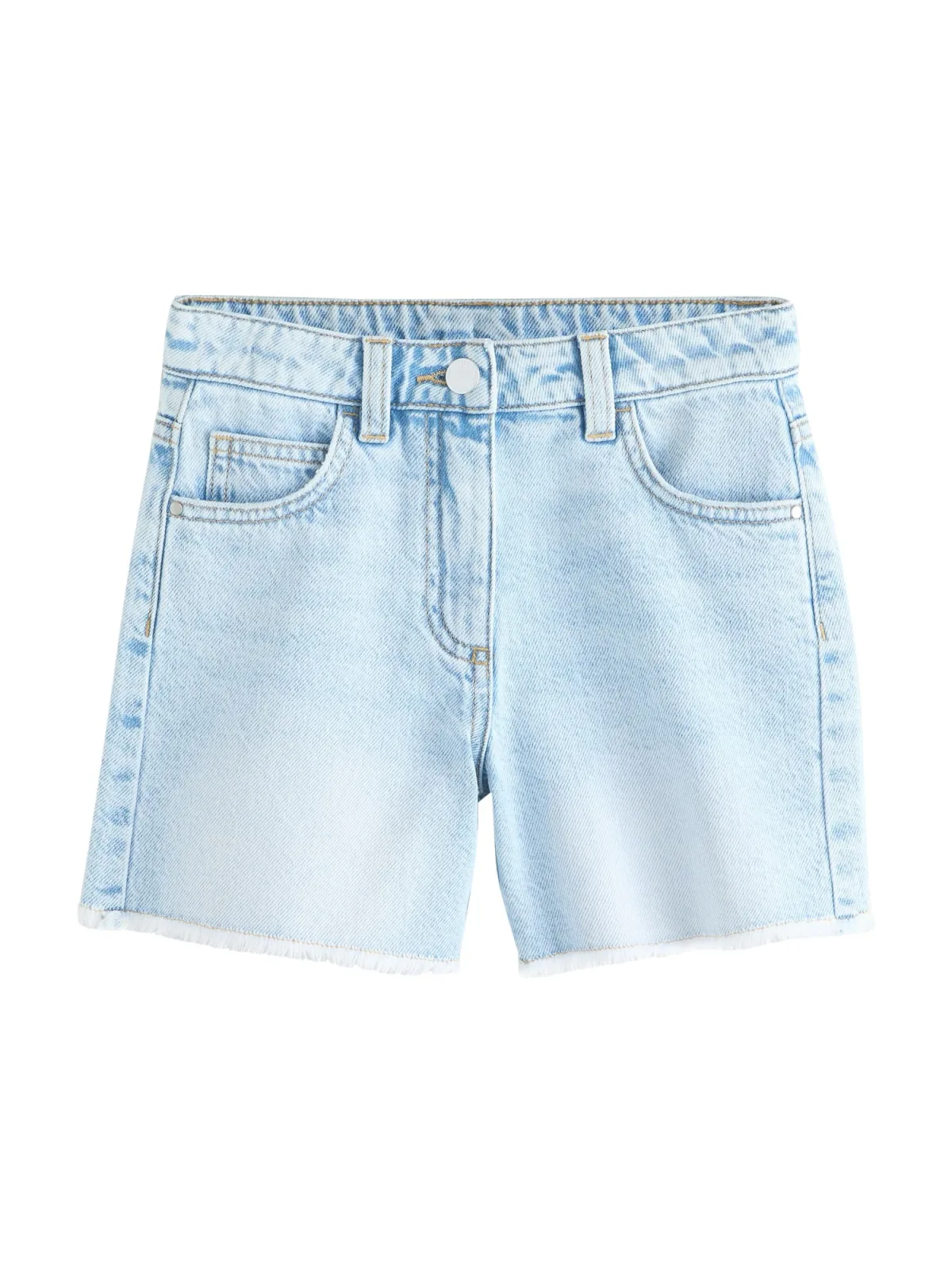 Design: 5-pocket-style; Type sluiting: Ritssluiting; Materiaal: Denim; Motief: Effen; Details: Franjes; Extra's: Riemlussen; Wassing: Light washed; Lengte: Knielengte; Pasvorm: Regular