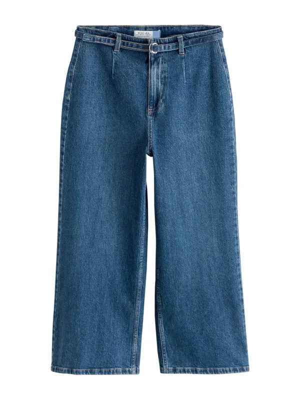 Design: Gevoerde zoom/rand; Type sluiting: Ritssluiting; Materiaal: Denim; Motief: Effen; Extra's: Riemlussen; Wassing: Blauw denim; Lengte: 7/8 lengte; Pasvorm: Wide leg; Taillehoogte: Mid waist