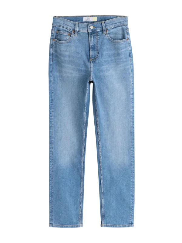 Design: Gevoerde zoom/rand, Ritssluiting, 5-pocket-style, Knop sluiting; Type sluiting: Ritssluiting; Materiaal: Denim; Motief: Effen; Extra's: Contrasterende naden, Vaste grip, Riemlussen; Wassing: Light washed; Lengte: Lang/maxi; Pasvorm: Slimfit; Taillehoogte: Mid waist