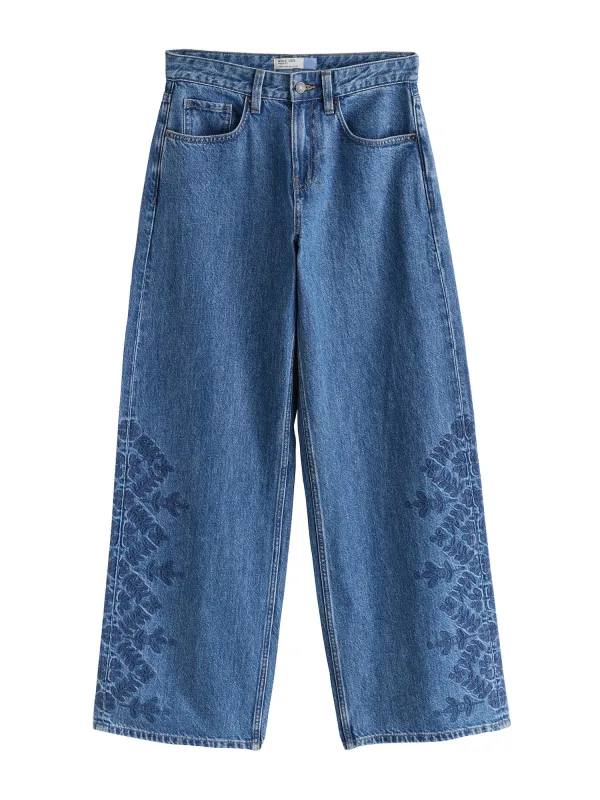 Design: Ritssluiting, 5-pocket-style; Type sluiting: Ritssluiting; Materiaal: Denim; Motief: Effen; Details: Borduursels; Extra's: Studs, Riemlussen; Wassing: Blauw denim; Lengte: Lang/maxi; Pasvorm: Wide leg; Taillehoogte: Mid waist