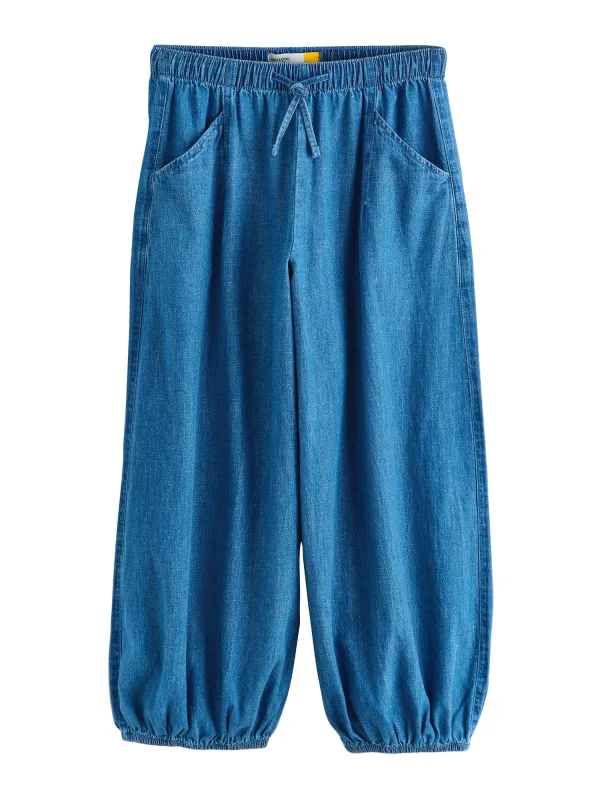 Design: Elastische taille/zoom; Materiaal: Denim; Motief: Effen; Details: Gedrapeerd; Extra's: Vaste grip; Wassing: Blauw denim; Lengte: Lang/maxi; Pasvorm: Tapered; Taillehoogte: High waist