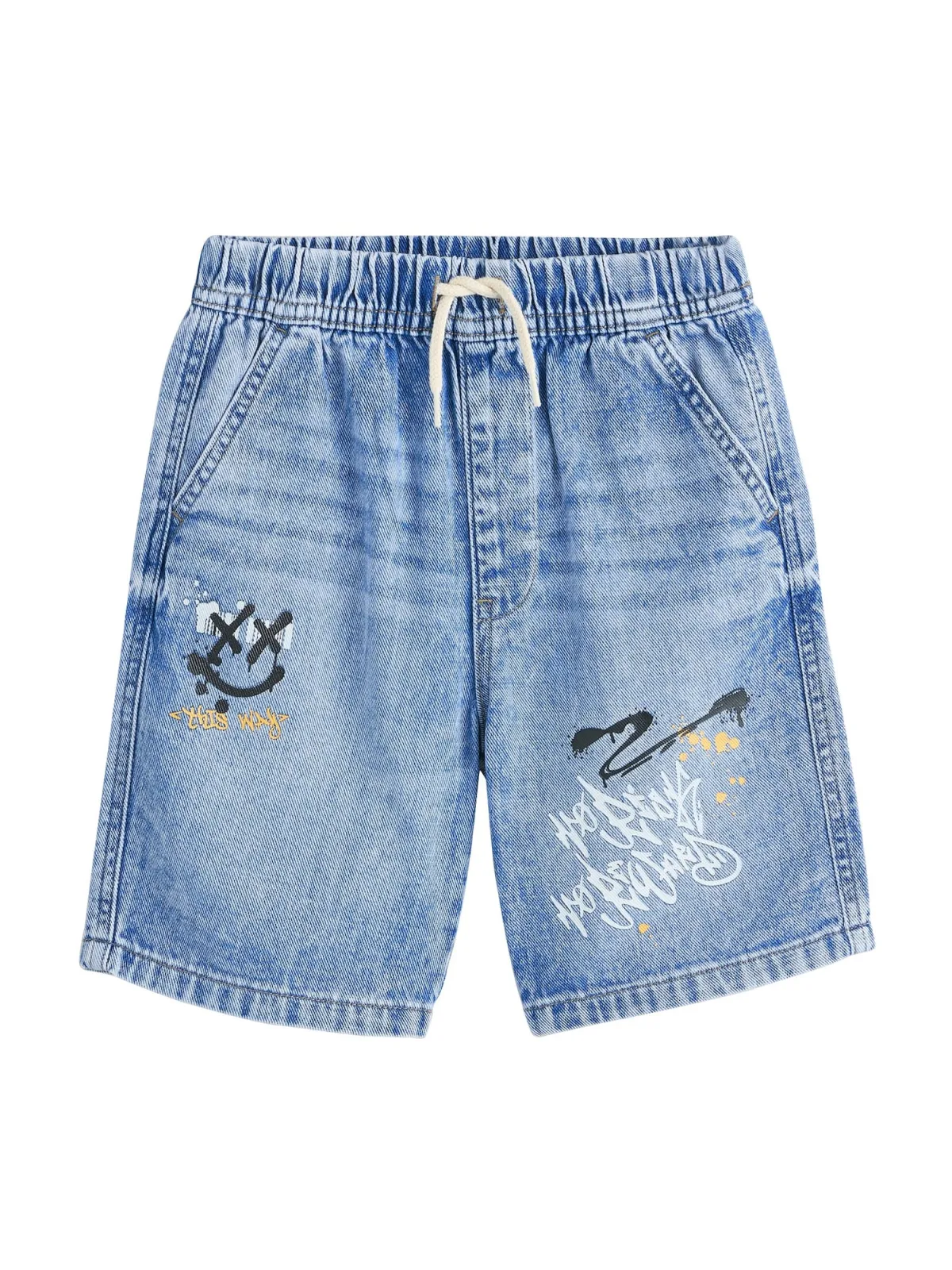 Design: Taille met trekkoord; Materiaal: Denim; Motief: Tekst print; Extra’s: Vaste grip; Wassing: Light washed; Lengte: Knielengte; Pasvorm: Normale pasvorm; Pasvorm: Regular