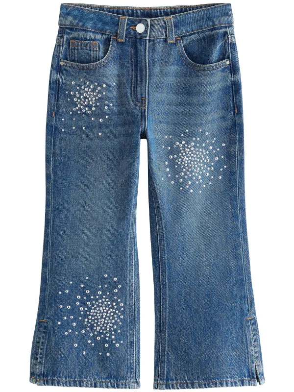 Design: Gevoerde zoom/rand, 5-pocket-style; Type sluiting: Ritssluiting; Materiaal: Denim; Details: Sierstenen; Extra's: Applicaties, Contrasterende naden; Wassing: Heavy washed; Lengte: 7/8 lengte; Pasvorm: Flared