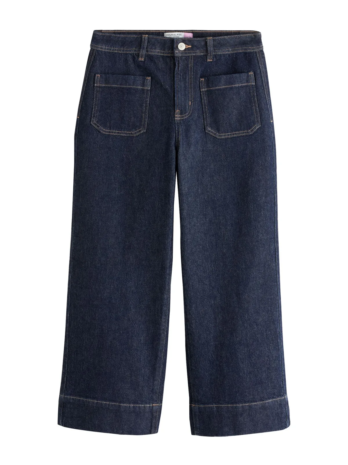 Design: Rechte zoom, Ritssluiting, Achterzak, Zakken aan de zijkant; Type sluiting: Ritssluiting; Materiaal: Denim; Motief: Effen; Extra’s: Contrasterende naden, Riemlussen; Wassing: Rinsed/dark washed; Lengte: 7/8 lengte; Pasvorm: Loosefit; Taillehoogte: Mid waist
