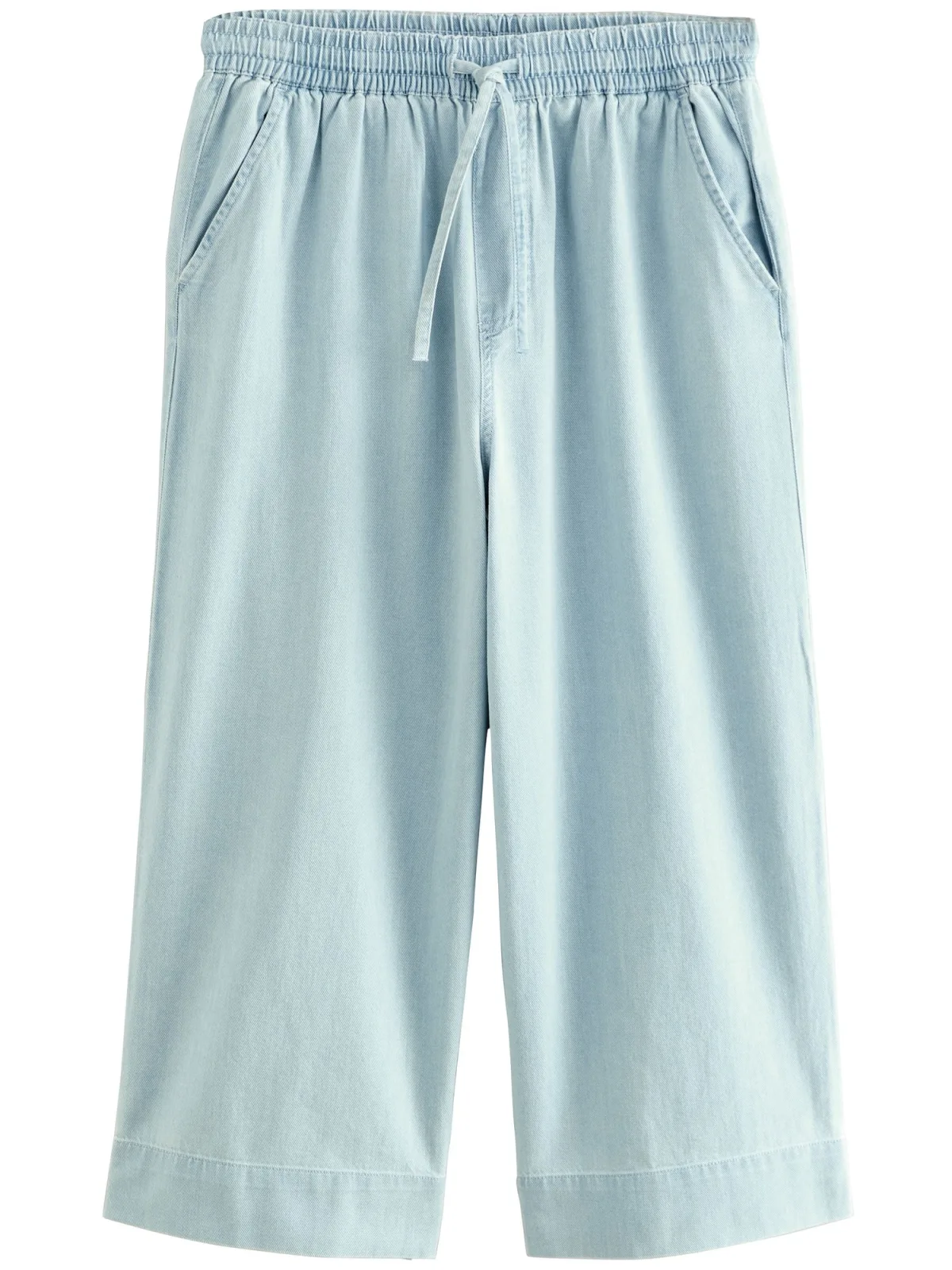 Design: Elastische taille/zoom; Materiaal: Denim; Motief: Effen; Details: Gedrapeerd; Extra's: Lichte stof; Wassing: Light washed; Lengte: 7/8 lengte; Pasvorm: Wide leg; Taillehoogte: Mid waist