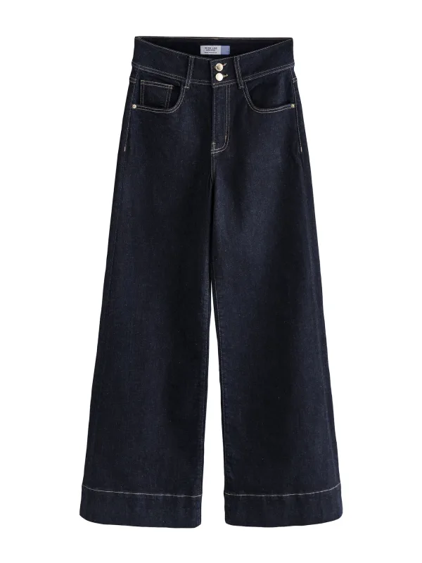 Design: 5-pocket-style; Type sluiting: Ritssluiting; Materiaal: Denim; Motief: Effen; Details: Plooien; Extra's: Studs; Wassing: Rinsed/dark washed; Lengte: Lang/maxi; Pasvorm: Wide leg; Taillehoogte: High waist