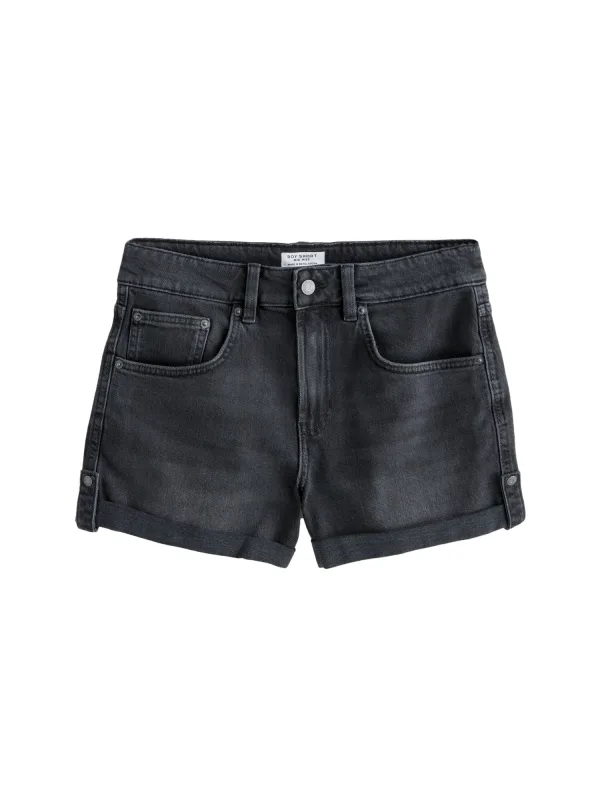 Design: 5-pocket-style; Type sluiting: Ritssluiting; Materiaal: Denim; Motief: Effen; Extra's: Studs; Wassing: Rinsed/dark washed; Lengte: Kort/mini; Pasvorm: Regular; Taillehoogte: Mid waist