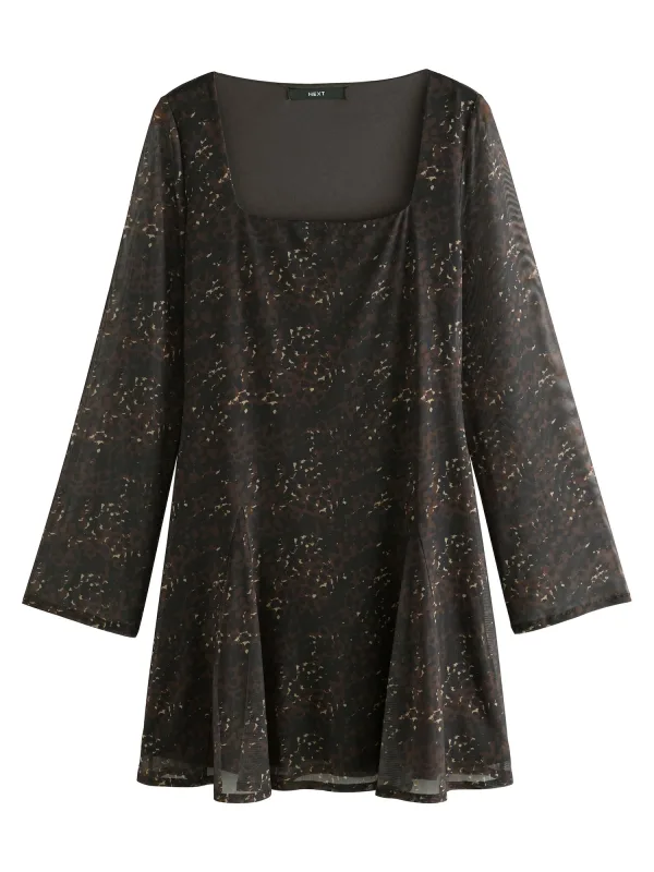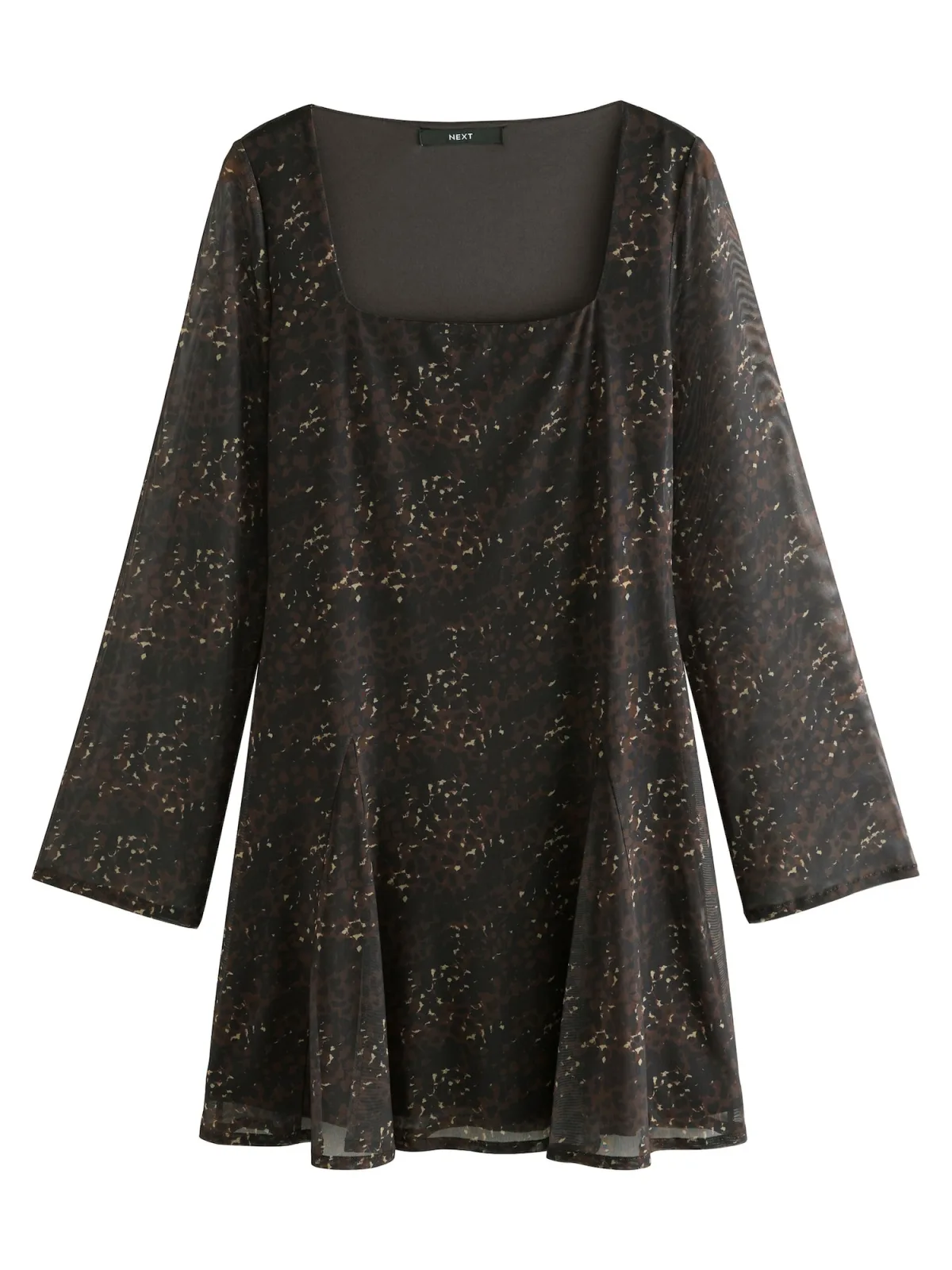 Design: Met onderjurk; Materiaal: Gerecycled materiaal; Halstype: Carréhals; Motief: Dierenprint; Extra's: All-over patroon; Lengte: Kort/mini; Snit: Getailleerd; Pasvorm: Slanke pasvorm; Armlengte: Lange mouw
