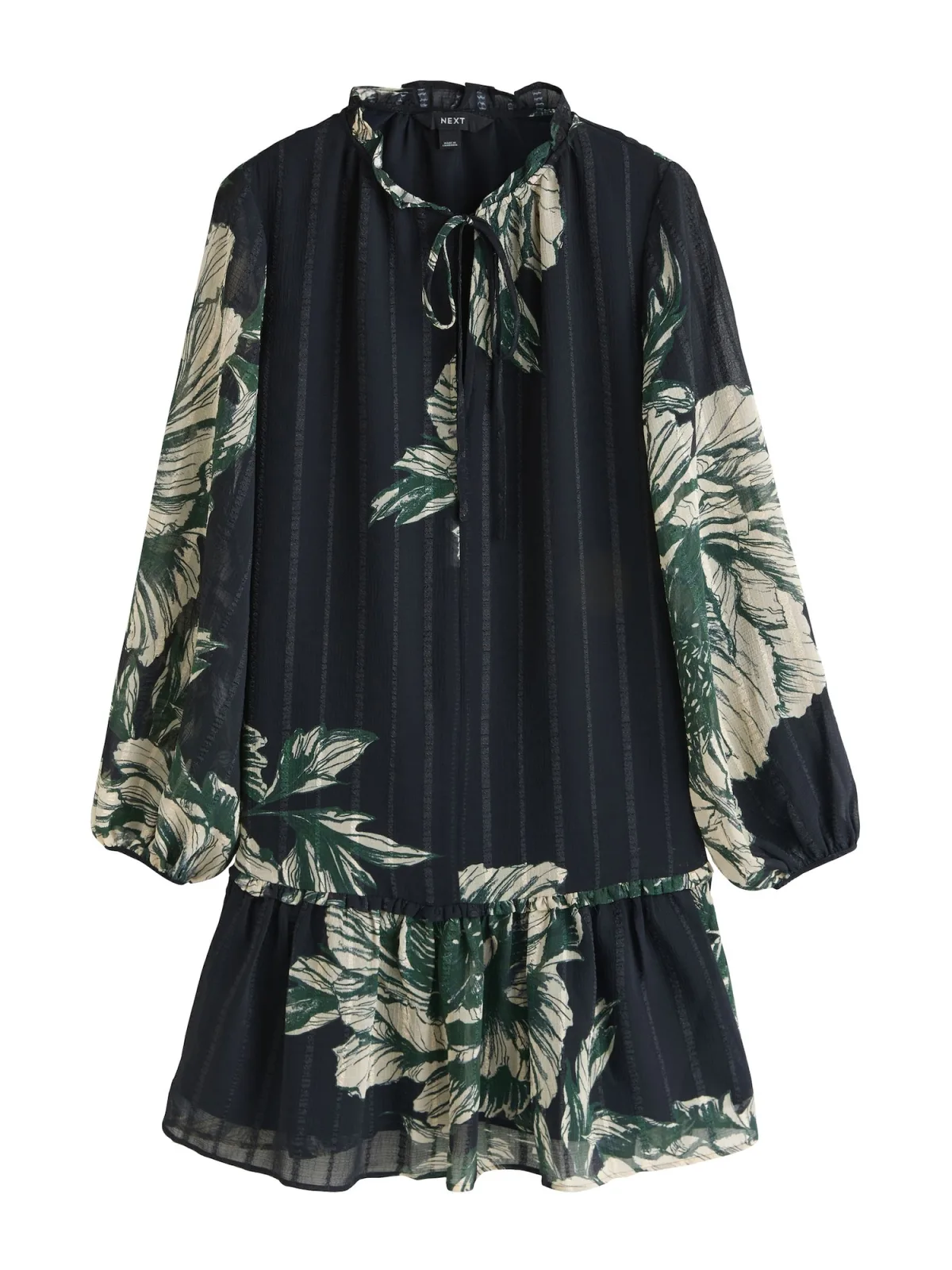 Design: Gevoerde zoom/rand, Pofmouwen, Om te knopen/binden; Halstype: Opstaande kraag; Motief: Bloemenprint; Details: Ruches, Volant, Gedrapeerd; Lengte: Kort/mini; Snit: Ovaal; Pasvorm: Losse pasvorm; Armlengte: Lange mouw