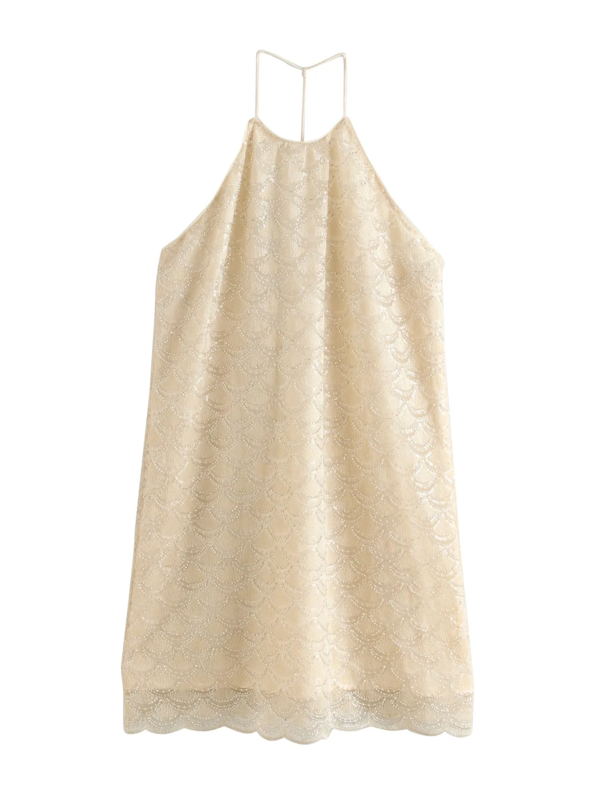Design: Geschulpte zoom; Halstype: Open rug; Motief: Effen; Soort bandjes: Haltermodel; Extra's: Glinsterend; Lengte: Kort/mini; Snit: Recht; Pasvorm: Normale pasvorm; Armlengte: Mouwloos