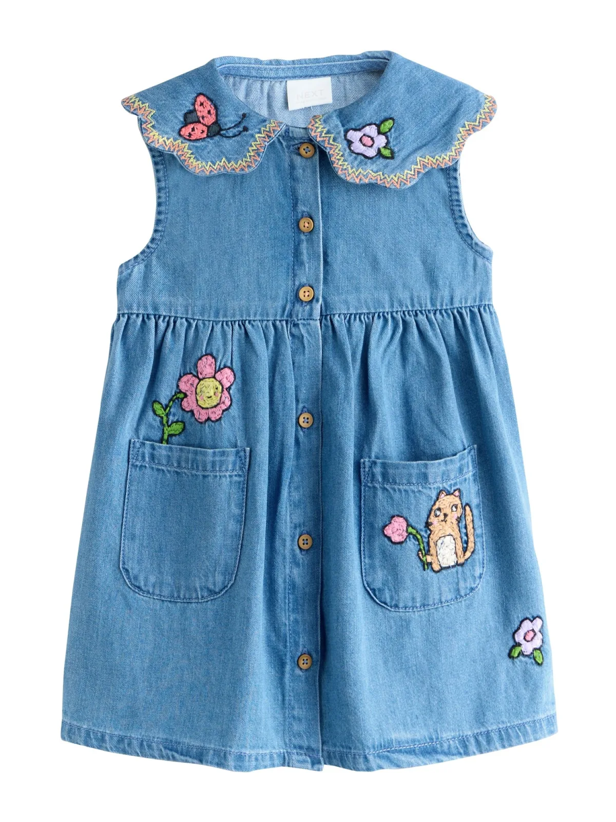 Design: Knop placket, Opgezette zakken, Knop sluiting; Type sluiting: Knoopsluiting; Materiaal: Denim; Halstype: Peter Pan kraag; Motief: Motiefprint; Details: Borduursels; Extra's: Label patch/label flag, Op staal naden; Lengte: Lang/maxi; Pasvorm: Normale pasvorm; Armlengte: Mouwloos