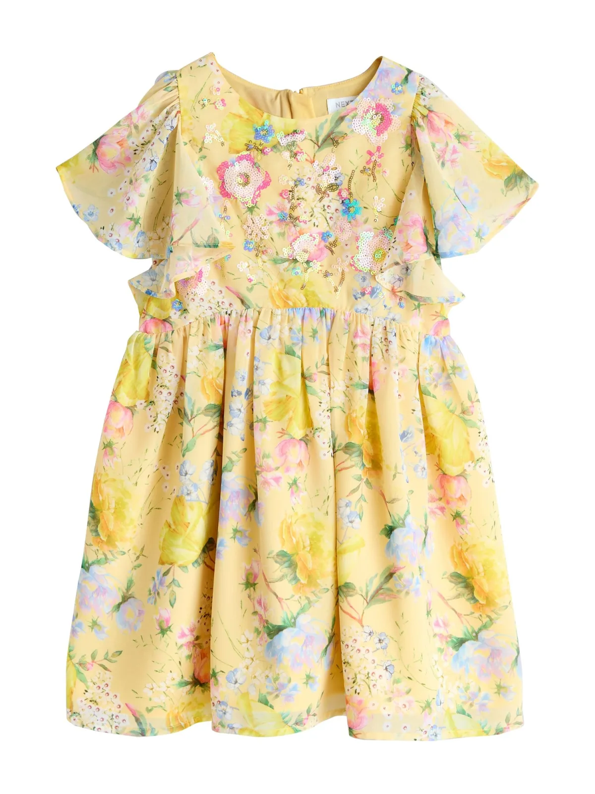 Design: Pofmouwen, Rug rits; Type sluiting: Ritssluiting; Materiaal: Gerecycled materiaal; Halstype: Ronde hals; Motief: Bloemenprint; Details: Pailletten, Volant, Gedrapeerd; Extra's: Glitterend, All-over patroon, Met textuur; Lengte: Knielengte; Snit: Getailleerd; Pasvorm: Normale pasvorm; Armlengte: Kwartmouw