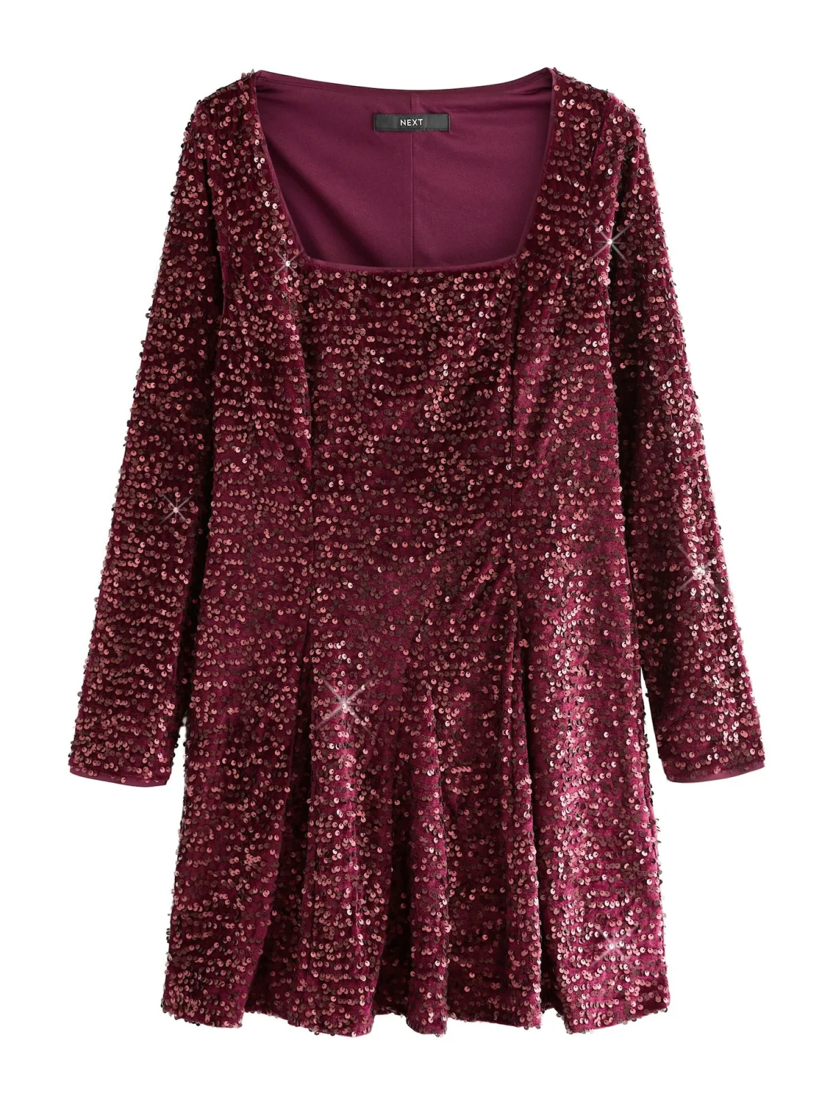 Design: Rechte zoom; Materiaal: Gerecycled materiaal; Halstype: Carréhals; Motief: Effen; Details: Pailletten, Plooien; Extra's: Glitterend, Voelt zacht aan; Lengte: Kort/mini; Pasvorm: Normale pasvorm; Armlengte: Lange mouw
