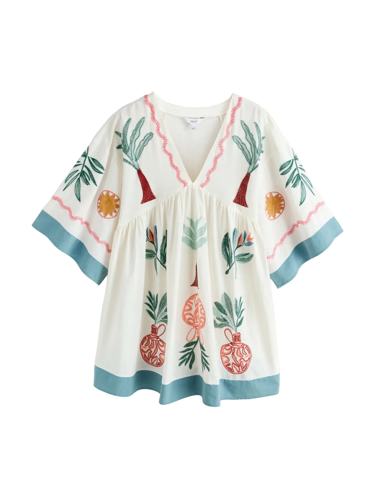 Design: Flare; Type sluiting: Slip; Materiaal: Katoen; Halstype: V-hals; Motief: Motiefprint; Soort bandjes: Brede bandjes; Details: Borduursels; Extra's: All-over patroon, Fully fashioned; Lengte: Kort/mini; Snit: Uitlopend; Pasvorm: Losse pasvorm; Armlengte: Driekwart mouw