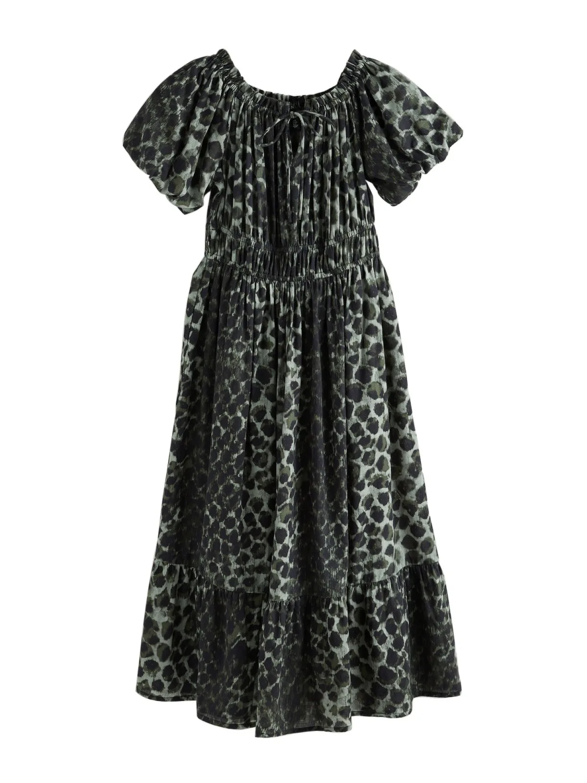 Design: Met band/snoer, Strapless/off-shoulder; Materiaal: Katoen; Halstype: Carmen hals; Motief: Dierenprint; Details: Cut-outs, Ruches, Volant, Gedrapeerd; Extra's: All-over patroon, Voelt zacht aan; Lengte: 3/4 lengte; Snit: Getailleerd; Pasvorm: Normale pasvorm; Armlengte: Kwartmouw