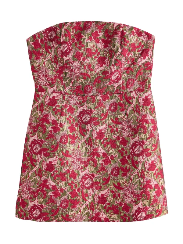 Design: Gevoerde zoom/rand, Rechte zoom; Type sluiting: Ritssluiting; Materiaal: Viscose; Motief: Bloemenprint; Soort bandjes: Bandeau; Extra's: All-over patroon, Jacquard patroon, Met textuur; Lengte: Kort/mini; Snit: Getailleerd; Pasvorm: Normale pasvorm; Armlengte: Mouwloos