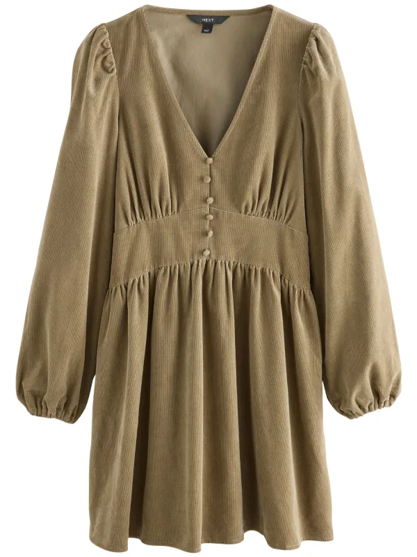 Design: Pofmouwen; Materiaal: Corduroy; Halstype: V-hals; Motief: Effen; Details: Gedrapeerd; Extra's: Op staal naden; Lengte: Kort/mini; Snit: Getailleerd; Pasvorm: Normale pasvorm; Armlengte: Lange mouw