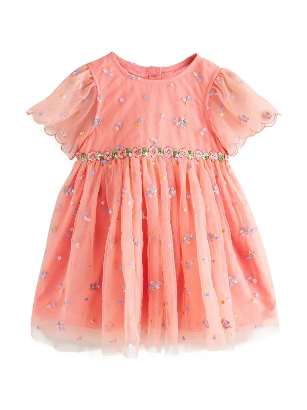 Design: Met onderjurk; Type sluiting: Knoopsluiting; Materiaal: Tule; Halstype: Ronde hals; Motief: Bloemenprint; Details: Borduursels, Gedrapeerd; Extra's: Applicaties; Lengte: Knielengte; Pasvorm: Wijde pasvorm; Armlengte: Kwartmouw