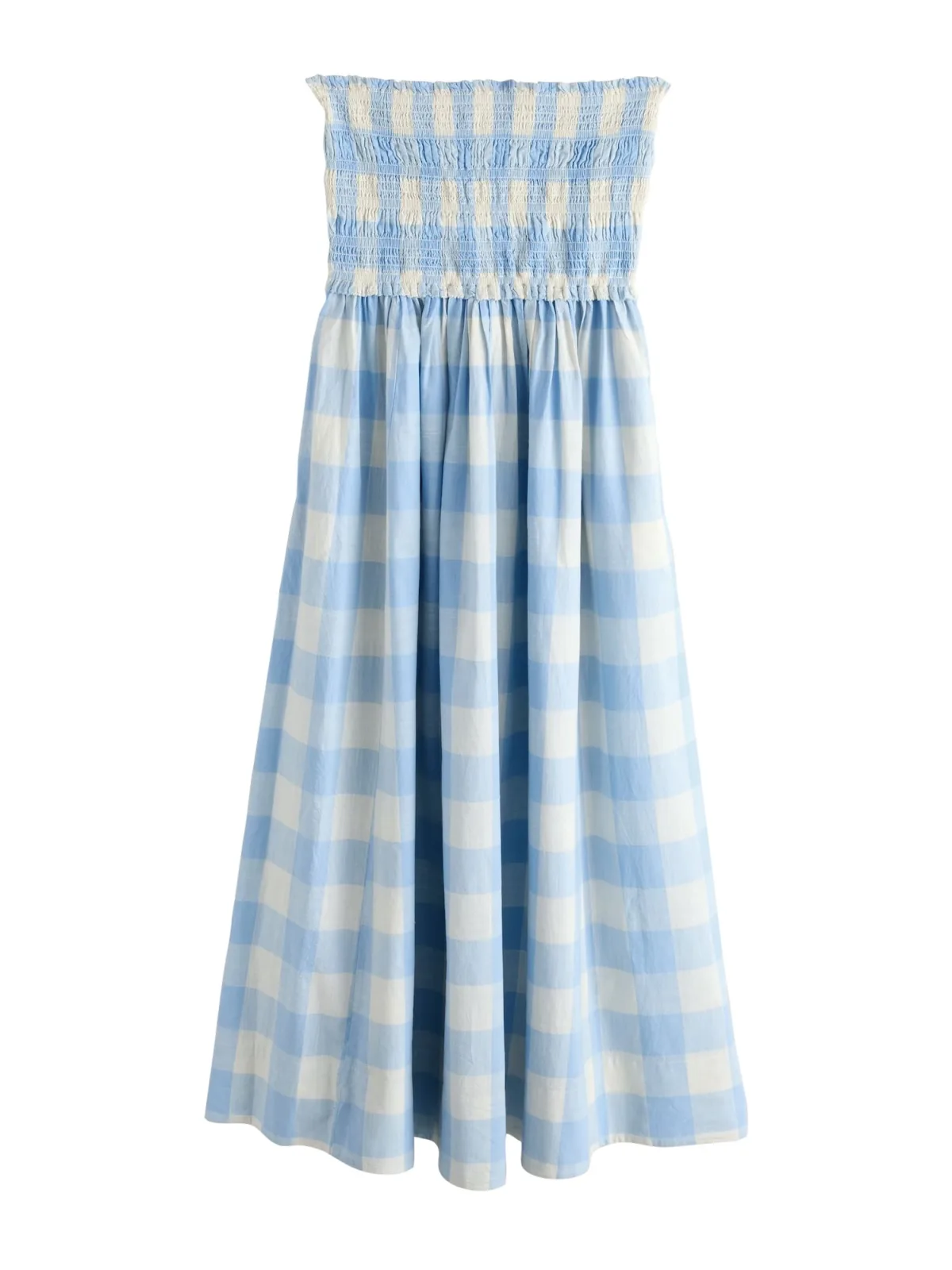 Design: Gevoerde zoom/rand, Strapless/off-shoulder; Materiaal: Katoen; Motief: Geruit; Soort bandjes: Bandeau; Details: Ruches, Gedrapeerd; Extra's: All-over patroon; Lengte: 7/8 lengte; Snit: Getailleerd; Pasvorm: Normale pasvorm; Armlengte: Mouwloos