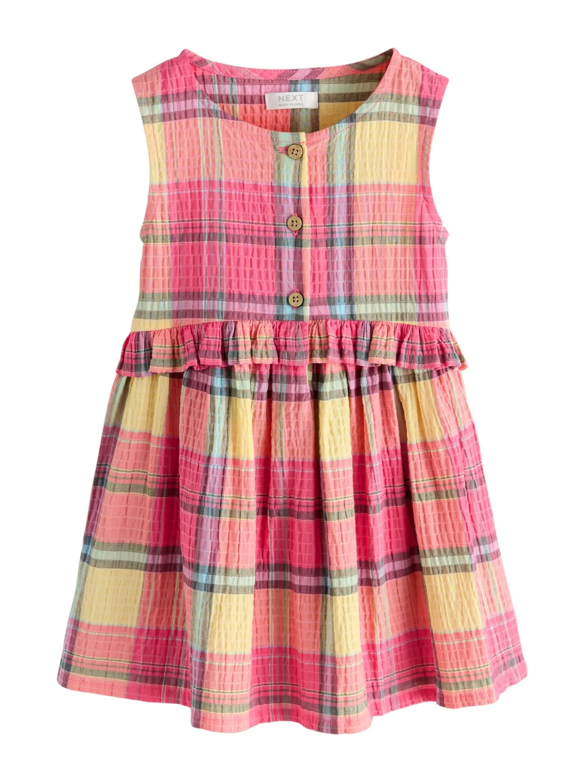 Design: Gevoerde zoom/rand, Knop placket; Type sluiting: Knoopsluiting; Materiaal: Katoen; Halstype: Ronde hals; Motief: Geruit; Soort bandjes: Brede bandjes; Details: Ruches, Gedrapeerd; Extra's: All-over patroon, Met textuur, Voelt zacht aan; Lengte: Knielengte; Snit: Uitlopend; Pasvorm: Normale pasvorm; Armlengte: Mouwloos