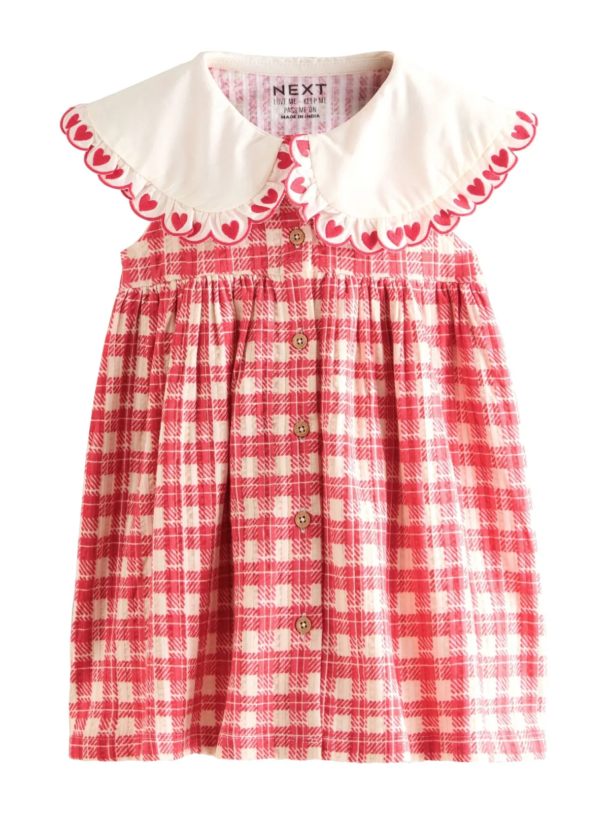 Design: Rechte zoom; Type sluiting: Knoopsluiting; Materiaal: Katoen; Halstype: Peter Pan kraag; Motief: Geruit; Details: Gedrapeerd; Extra's: All-over patroon; Lengte: Knielengte; Pasvorm: Normale pasvorm; Armlengte: Mouwloos