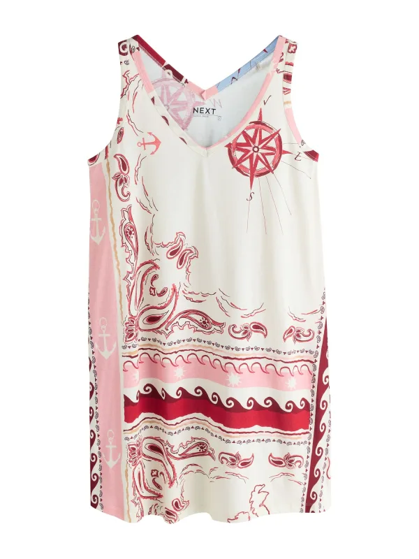 Design: Gevoerde zoom/rand; Materiaal: Katoen; Halstype: V-hals; Soort bandjes: Normale bandjes; Extra's: All-over patroon; Lengte: Kort/mini; Snit: Recht; Pasvorm: Losse pasvorm; Armlengte: Mouwloos