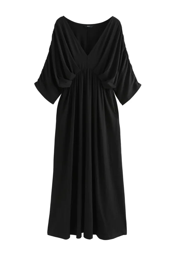 Design: Gevoerde zoom/rand; Materiaal: Jersey; Halstype: V-hals; Motief: Effen; Details: Plooien, Gedrapeerd; Extra's: Op staal naden, Voelt zacht aan; Lengte: Lang/maxi; Snit: Uitlopend; Pasvorm: Normale pasvorm; Armlengte: Driekwart mouw