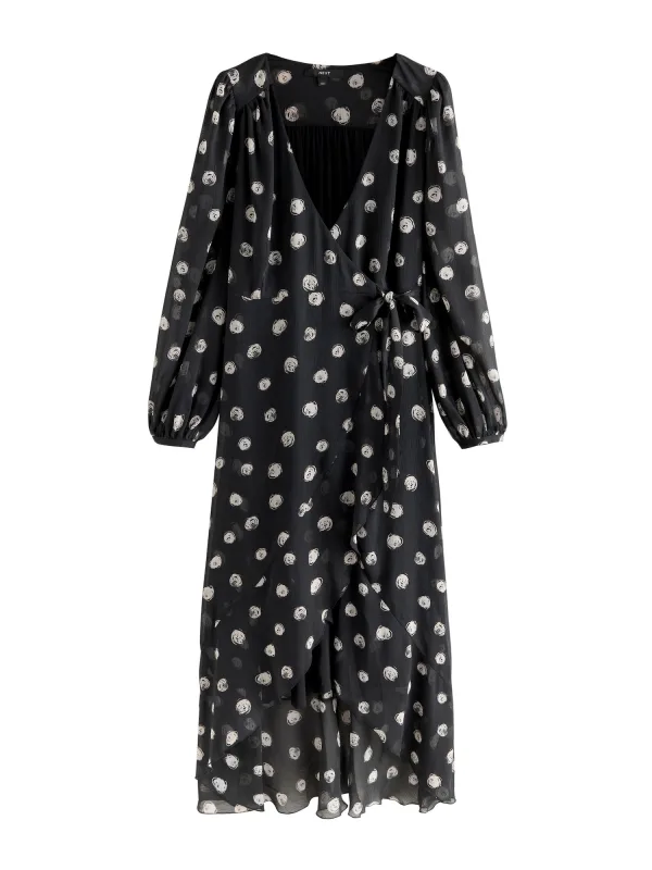 Design: Diepe snit/decolleté; Materiaal: Gerecycled materiaal; Halstype: V-hals; Motief: Gestippeld; Details: Gedrapeerd, Wikkel design; Extra's: All-over patroon; Lengte: Lang/maxi; Snit: Getailleerd; Pasvorm: Normale pasvorm; Armlengte: Lange mouw