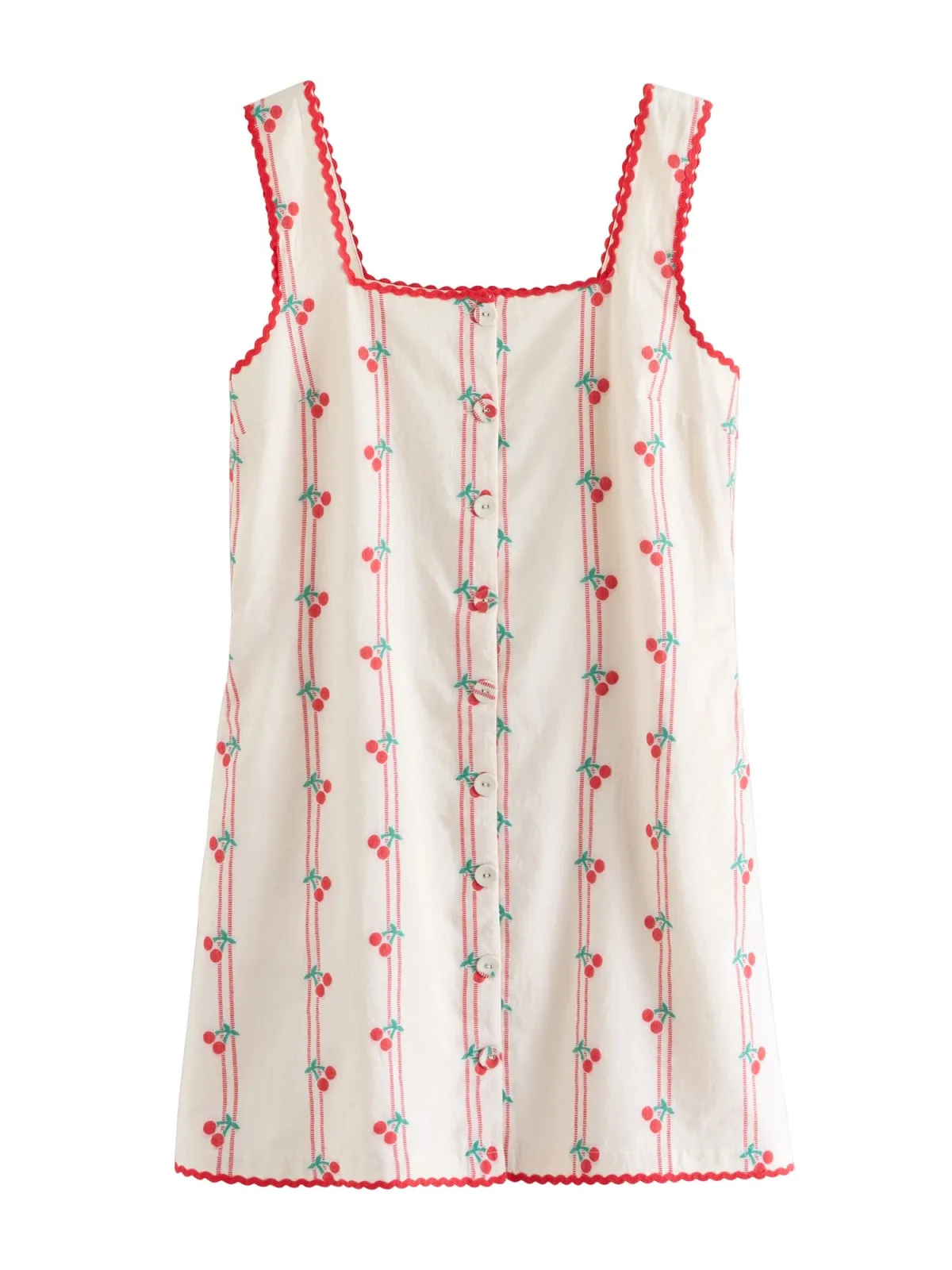Design: Knop placket, Geschulpte zoom; Type sluiting: Knoopsluiting; Materiaal: Katoen; Halstype: Carréhals; Soort bandjes: Normale bandjes; Extra's: All-over patroon, Op staal naden; Lengte: Kort/mini; Pasvorm: Normale pasvorm; Armlengte: Mouwloos