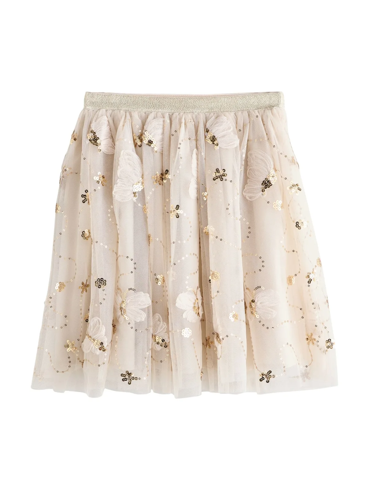 Design: Elastische taille/zoom; Materiaal: Tule; Rokvorm: A-lijn rok; Details: Gedrapeerd; Extra's: Applicaties; Lengte: Knielengte