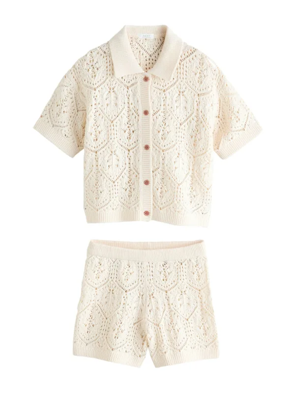 Design: Geribbelde kraag, Elastische taille/zoom, Geribd ceintuurtje; Type sluiting: Knoopsluiting; Materiaal: Knitwear; Motief: Effen; Extra's: Fully fashioned, Met textuur; Aantal per set: 2-delig; Lengte: Kort/mini; Setinhalt Kleidung: Strickjacke, Hose; Pasvorm: Normale pasvorm; Armlengte: Kwartmouw