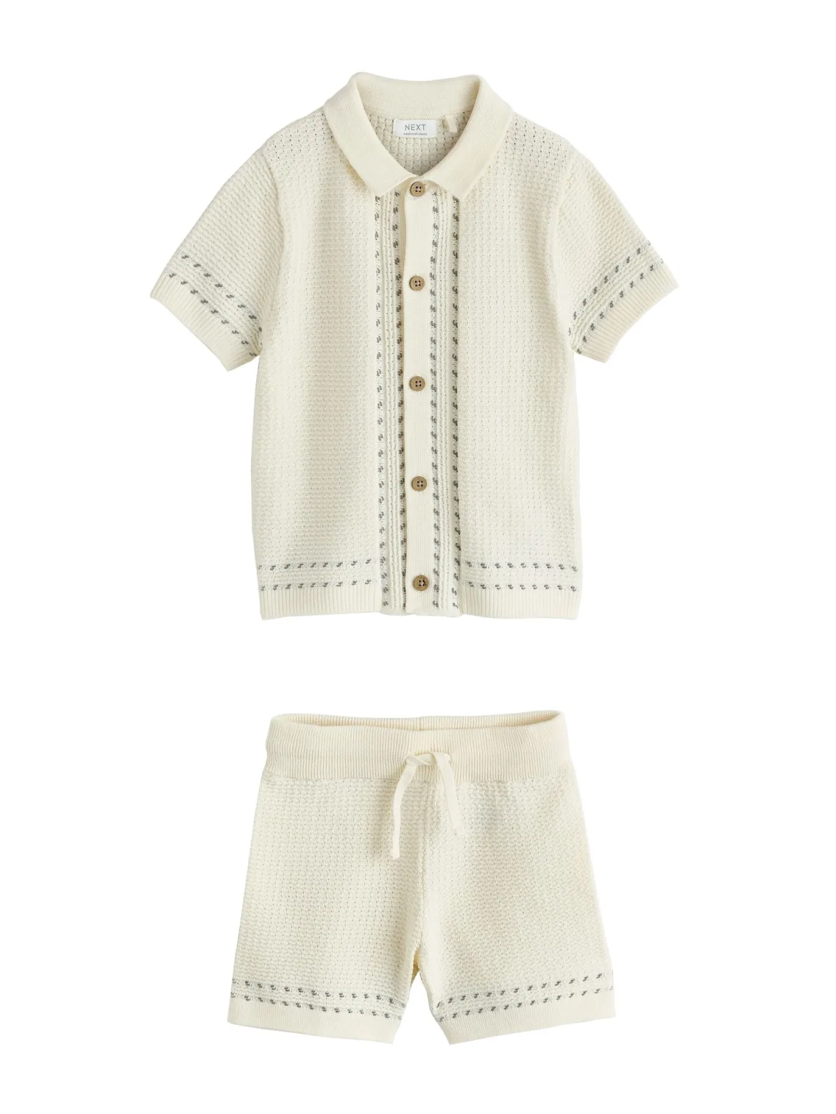 | Prijsgeschiedenis voor Next groen Set van gebreid poloshirt met textuur en knoopsluiting en korte broek | |