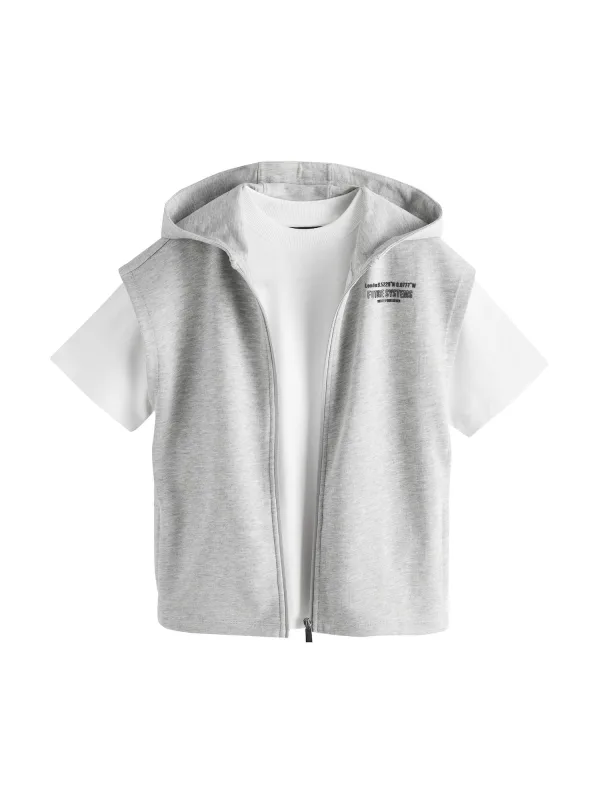 Design: Geribbelde kraag, Met capuchon; Materiaal: Jersey; Motief: Mélange; Extra's: Voelt zacht aan, Huidvriendelijk materiaal; Aantal per set: 2-delig; Lengte: Kort/mini; Setinhalt Kleidung: Weste, Shirt; Armlengte: Kwartmouw